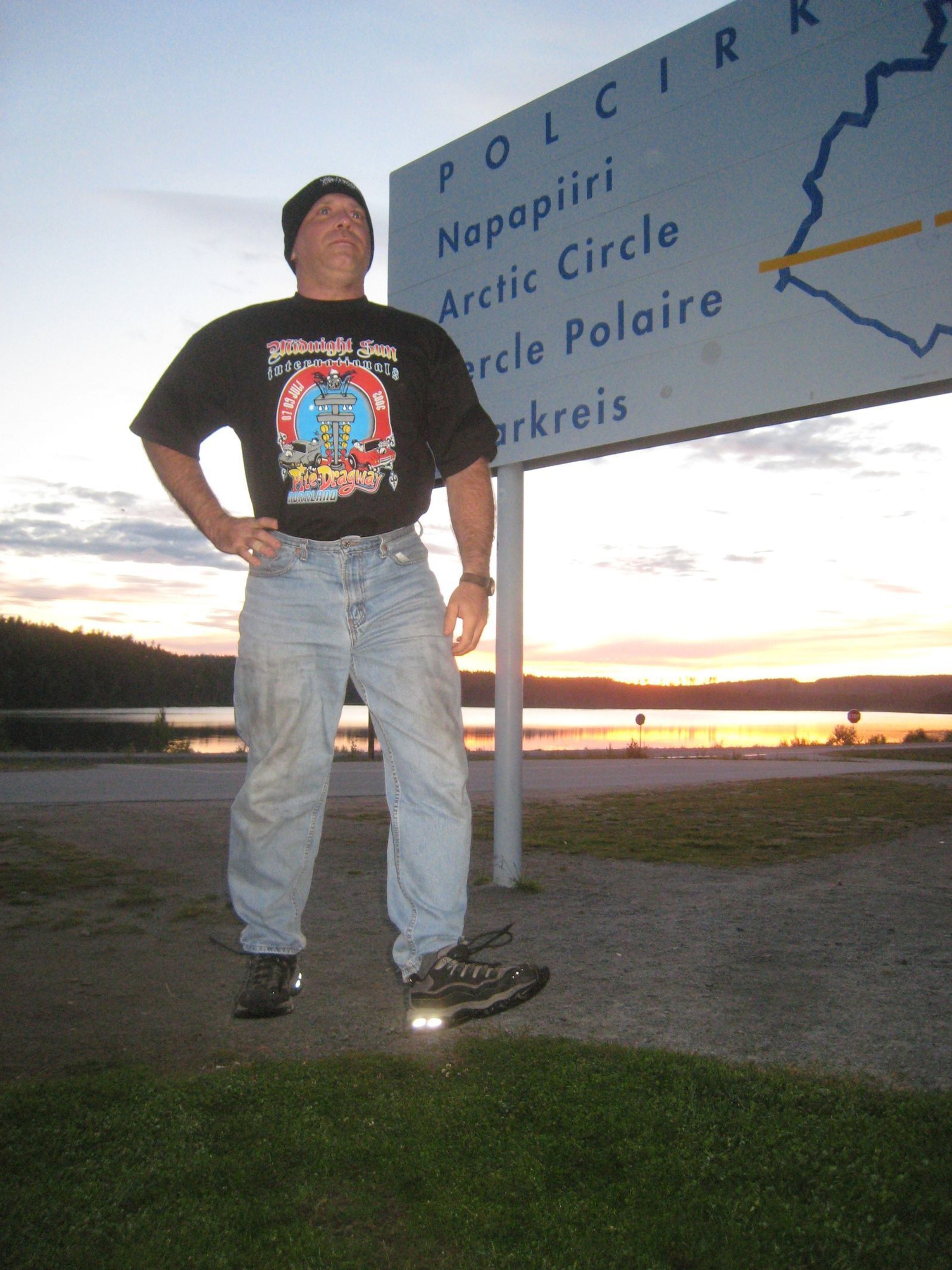 Ja, det blev att sväva för Karl då vi anlände vid polcirkeln just innan Jokkmokk. Här slog vi även läger för natten. En bra dagstur från Fällfors.