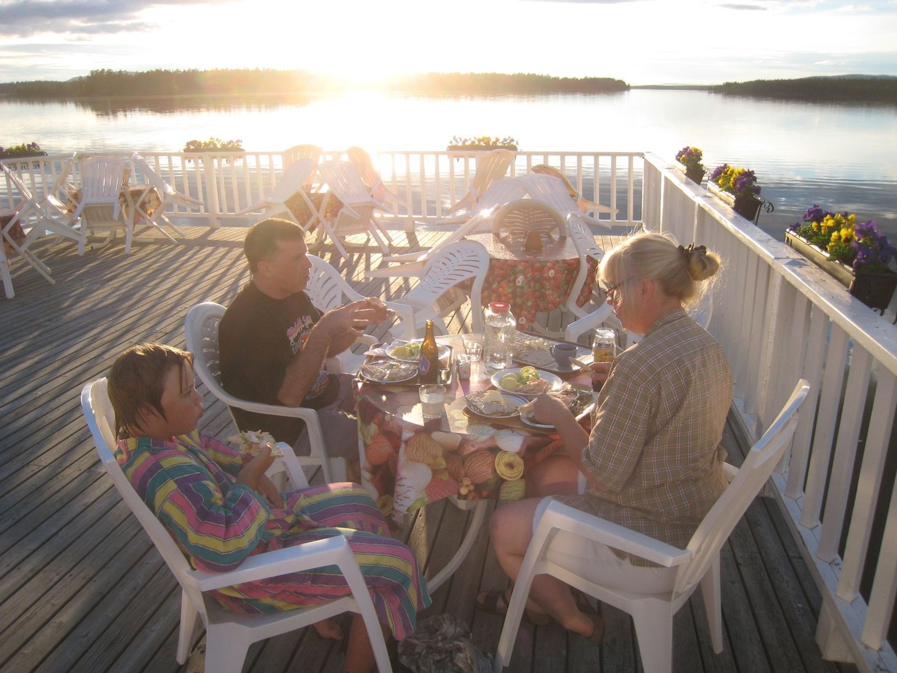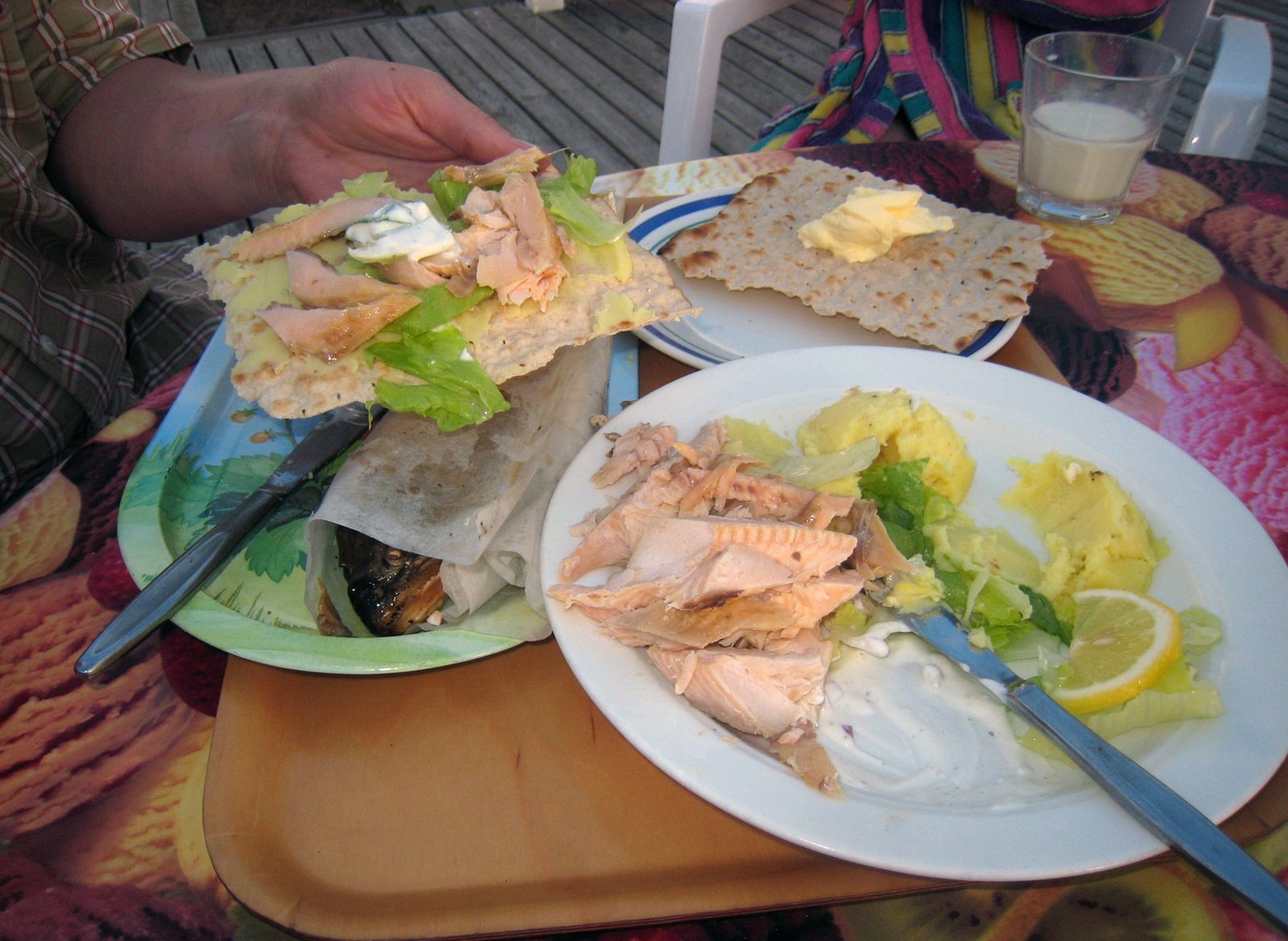 I Moskosel blev det rökt fjällröding i solnedgången. Det blev en fin kompensation till den påtvingade surströmmingen för Karl tidigare. Dagar som denna! Notera äkta plaststolar!