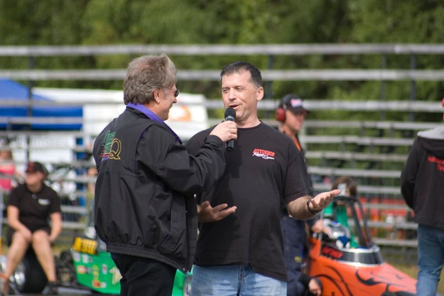Speakern Björn Sundqvist intervjuade Karl länge och väl eftersom det var den första amerikan som tävlade på Pite Dragway. Många amerikaner har varit här genom åren som medlemmar i teamen (bland annat proffset Gary Burgin) men Karl körde själv. Björn tyckte det var roligt att vi i teamet skojat om att amerikanens namn lät som "kvalelvan" vilket han också riktigt gnuggade in.